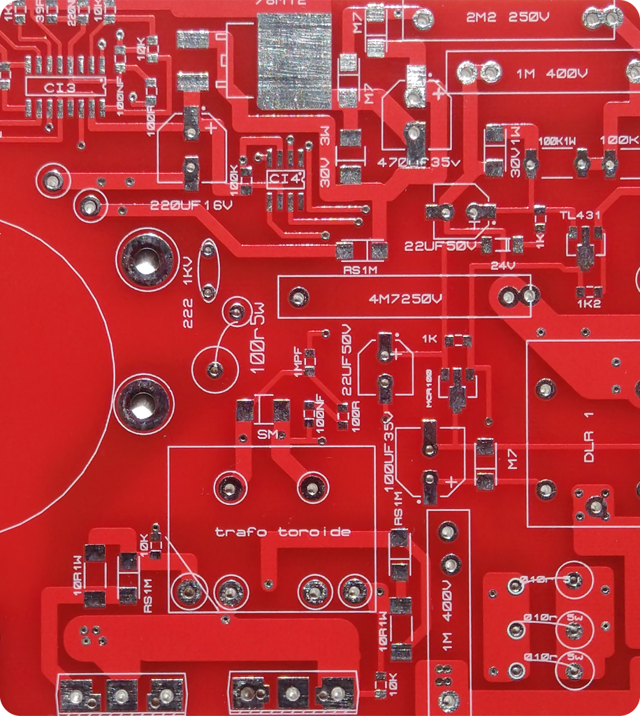 A cor vermelha é frequentemente usada em equipamentos de precisão, incluindo osciloscópios, fontes analógicas e multímetros. A cor da máscara anti-solda vermelha tende a ser ousada e profissional. O contraste entre a superfície e a trajetória das trilhas são excelentes.